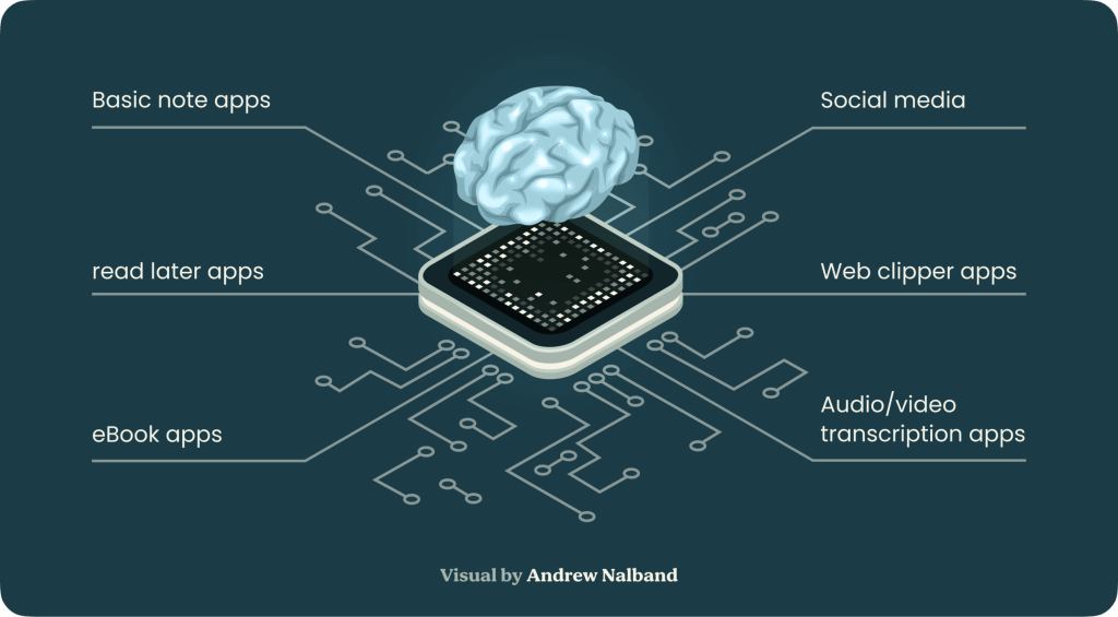 We are already consuming or producing this information, we just need to keep it in a single, centralized place, such as a digital notetaking app like Evernote, Microsoft OneNote, Notion, Apple Notes, Obsidian or others. These apps facilitate capturing small “snippets” of text as well as hyperlinks, images, webpages, screenshots, PDFs, and other attachments, all of which are saved permanently and synced across all your devices.