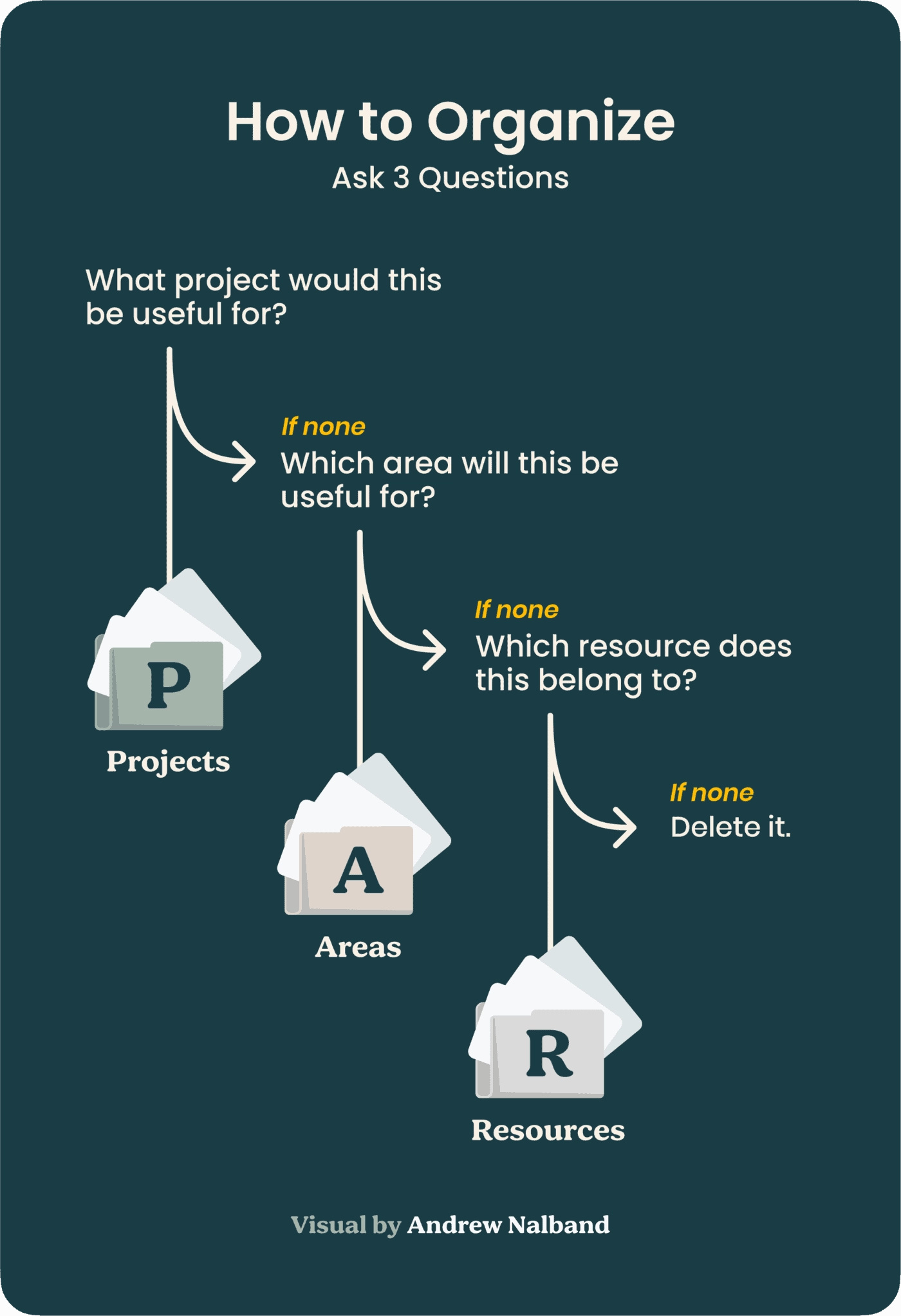 Ask yourself the following three questions to consider in which project, area, or resource a given piece of information will be most relevant and useful.