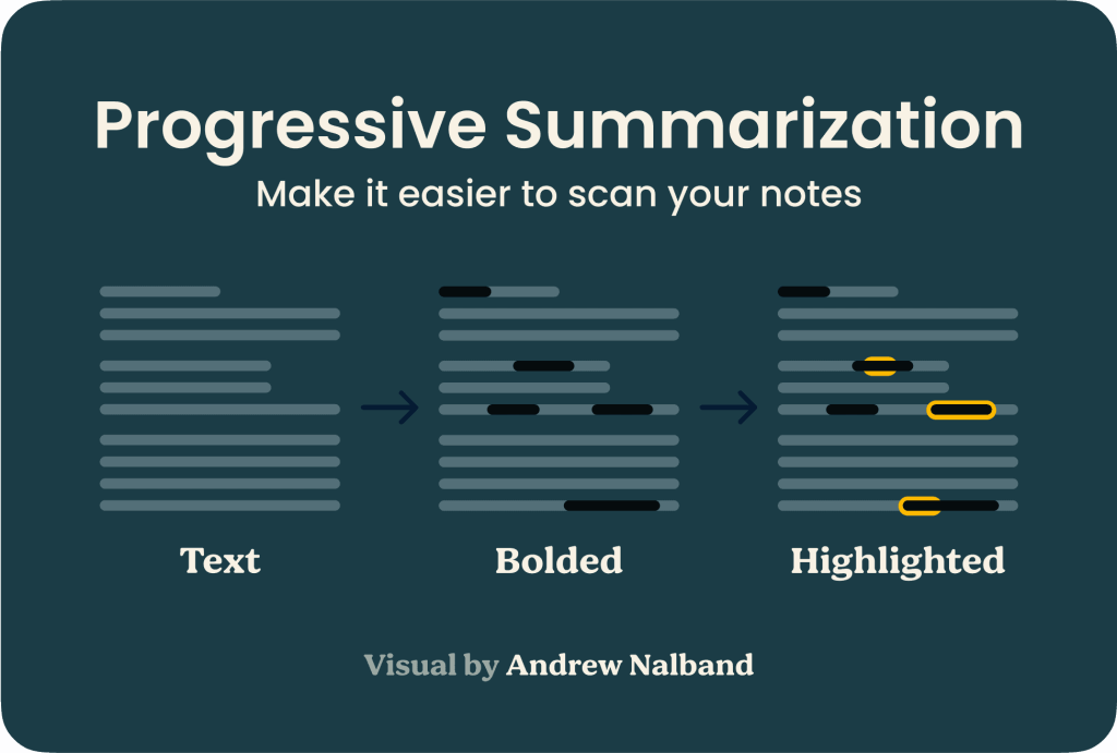 Progressive Summarization allows you to read the note in different ways for different purposes: in depth if you want to glean every detail, or at a high level if you just need the main takeaway. This allows you to review a note’s contents in seconds to decide if it’s useful for the task at hand.
