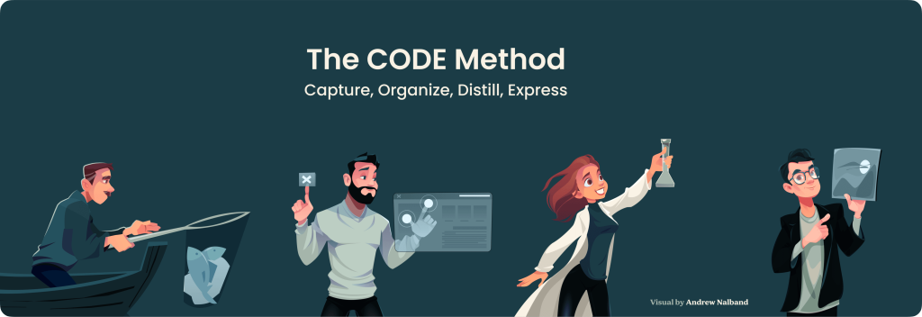 To guide you in the process of creating your own Second Brain, I’ve developed a simple four-step method called CODE, which stands for Capture, Organize, Distill, and Express.