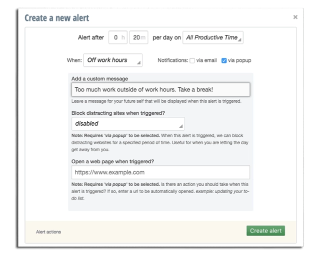 For example, you can set an Alert for 20 minutes (or more) of productive time outside of Work Hours so you know when youâve passed your limit.