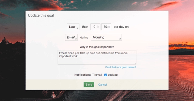 SMART goal: âI will set a RescueTime Alert to notify me when Iâve spent more than 20 minutes on work tasks outside of the workday to help build a habit of leaving work at work.â